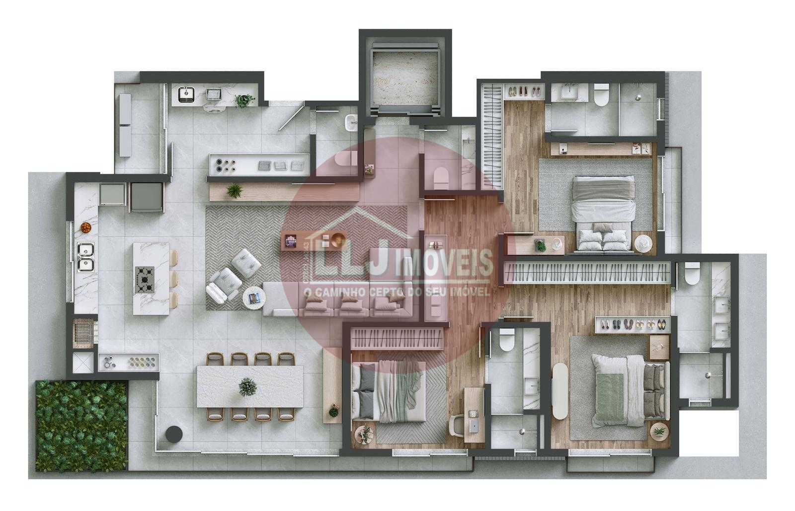 Planta de 165,96 m² privativos FACE NORTE, ANDAR ALTO 3 suítes 3 vagas individuais