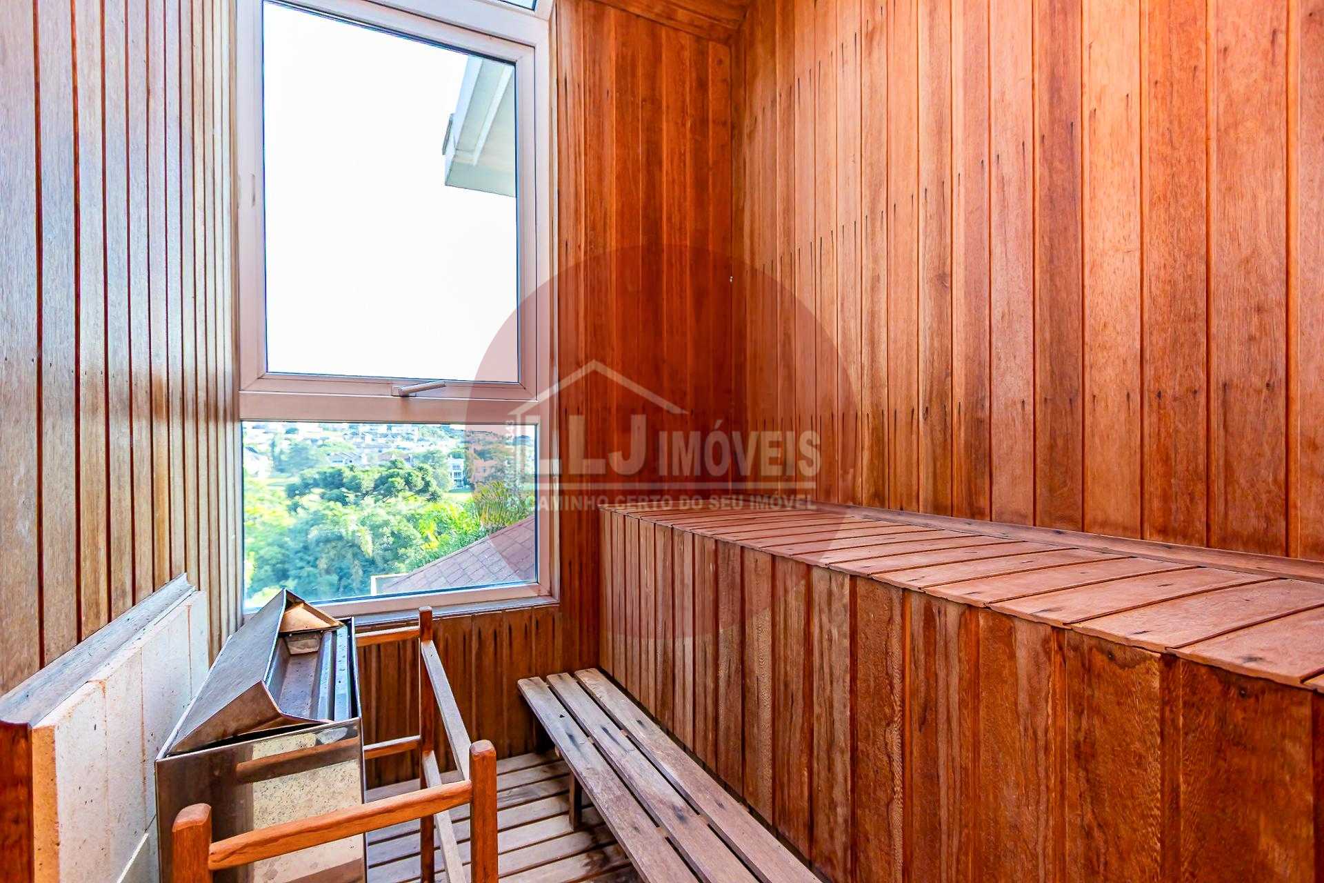 No pavimento superior estão as suítes. A suíte master é um grande destaque: possui lareira, varanda com vista para o golfe, dois closets (senhor e senhora) e um banheiro amplo com banheira e sauna seca com vista para o campo de golfe. Além dela, há mais duas suítes com armários, todas com sacada e vista aberta para a paisagem.