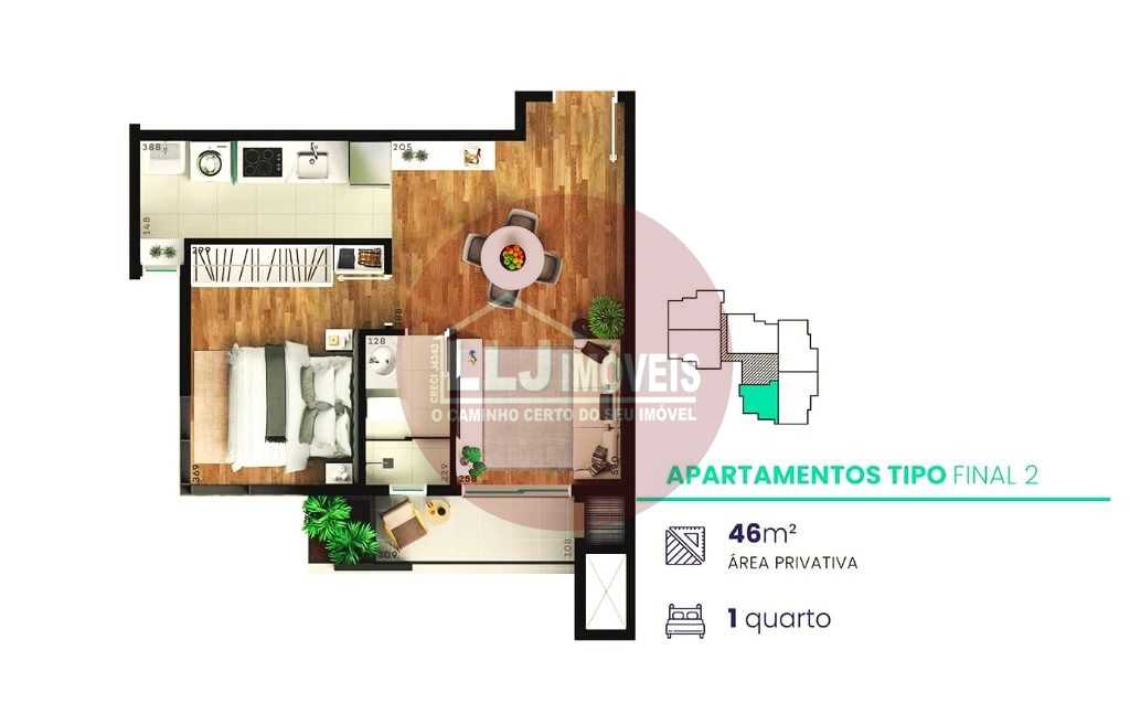 Com 46 m2 privativos, contendo sala para dois ambientes, sacada com churrasqueira a carvão, quarto, banheiro social, cozinha/serviço e 01 vaga de garagem.