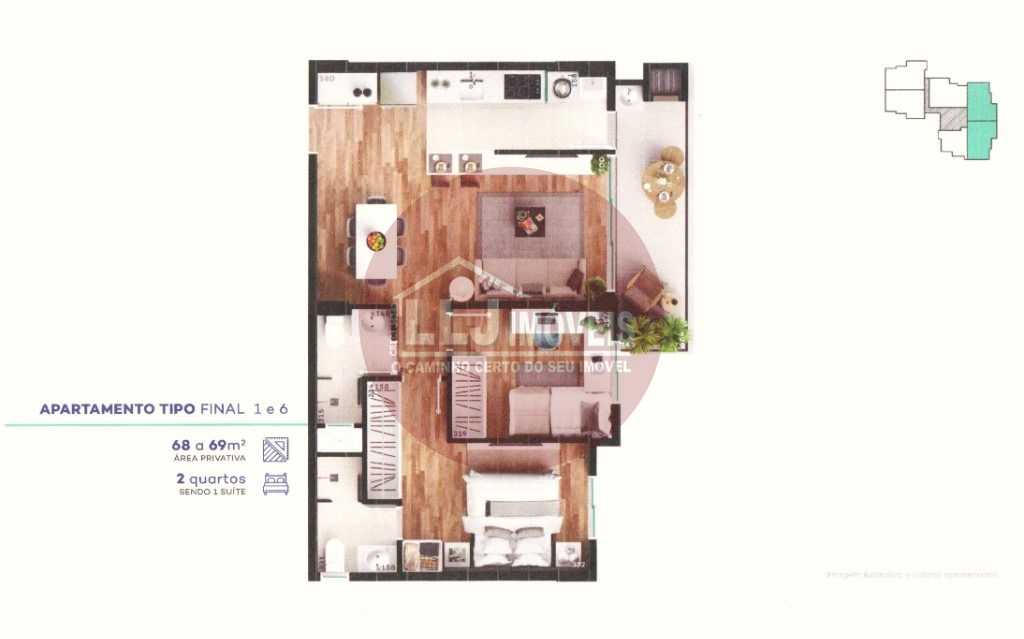 Com 67, 68 e 69 m2 privativos, contendo sala para dois ambientes, sacada com churrasqueira a carvão, 02 quartos (sendo 1 suíte), cozinha/serviço, 1 ou 2 vagas na garagem.